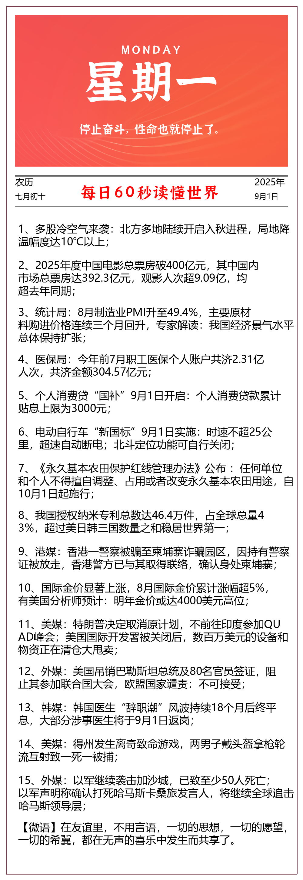 今日寄语【微语】少年若天性,习惯如自然。 今日新闻 1、新冠连续3周居门诊流感样病例就诊首位,专家称:在可控范围内; 2、湖南郴州发现全新B等位基因型血型:稀有程度远超“熊猫血”,将改写人类血型图谱; 3、河南信阳拟发文严控预售许可条件:新出让土地开发的商品房一律现房销售; 4、京东、美团、饿了么等外卖平台被五部门约谈:要求合法规范经营,公平有序竞争; 5、淘宝推出高退款人群屏蔽功能:商家可屏蔽“羊毛党”,仅对天猫、淘宝服饰行业商家开放; 6、网传耗资10亿的广东潮汕豪宅”英之园”将被强拆,官方回应: 属实,系非法占用集体工业土地违建违; 7、广州一饮品店命名“警茶”用疑似警察卡通图案引热议,市监回应:店主已自行拆除相关标识; 8、湖南张家界一村庄铁路穿村而过,多年来已有17人被火车撞身亡,官方回应:基本属实,铁路部门将装护栏; 9、沙县小吃沙特首店开业:店主是90后,首日营业额超5万5万人民币,卤蛋煎蛋约6.7元一个,一份蒸饺34元; 10、中美互降关税24小时:美国客户连夜转账下单,亚马逊卖家赶发货;美财长贝森特称未来几周中美双方或将继续谈; 11、特朗普修令下调对来自中...
