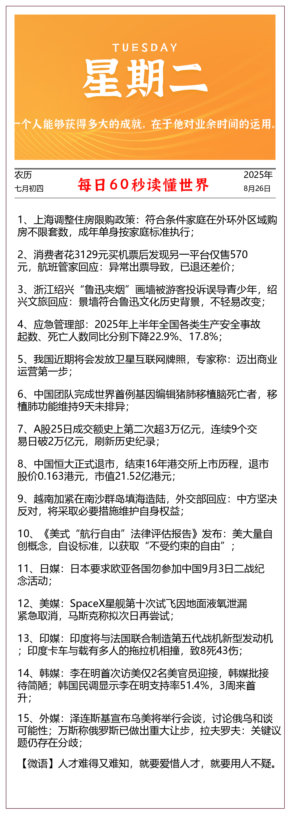 今日寄语【微语】少年若天性,习惯如自然。 今日新闻 1、新冠连续3周居门诊流感样病例就诊首位,专家称:在可控范围内; 2、湖南郴州发现全新B等位基因型血型:稀有程度远超“熊猫血”,将改写人类血型图谱; 3、河南信阳拟发文严控预售许可条件:新出让土地开发的商品房一律现房销售; 4、京东、美团、饿了么等外卖平台被五部门约谈:要求合法规范经营,公平有序竞争; 5、淘宝推出高退款人群屏蔽功能:商家可屏蔽“羊毛党”,仅对天猫、淘宝服饰行业商家开放; 6、网传耗资10亿的广东潮汕豪宅”英之园”将被强拆,官方回应: 属实,系非法占用集体工业土地违建违; 7、广州一饮品店命名“警茶”用疑似警察卡通图案引热议,市监回应:店主已自行拆除相关标识; 8、湖南张家界一村庄铁路穿村而过,多年来已有17人被火车撞身亡,官方回应:基本属实,铁路部门将装护栏; 9、沙县小吃沙特首店开业:店主是90后,首日营业额超5万5万人民币,卤蛋煎蛋约6.7元一个,一份蒸饺34元; 10、中美互降关税24小时:美国客户连夜转账下单,亚马逊卖家赶发货;美财长贝森特称未来几周中美双方或将继续谈; 11、特朗普修令下调对来自中...