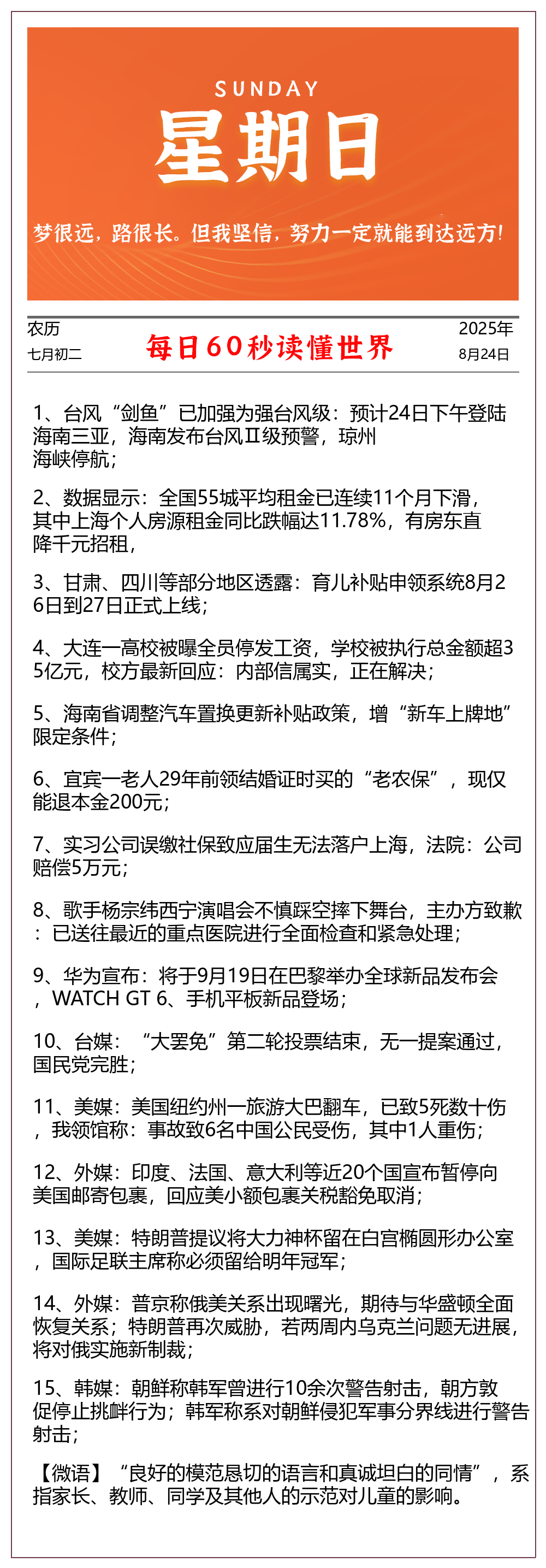 今日寄语【微语】少年若天性,习惯如自然。 今日新闻 1、新冠连续3周居门诊流感样病例就诊首位,专家称:在可控范围内; 2、湖南郴州发现全新B等位基因型血型:稀有程度远超“熊猫血”,将改写人类血型图谱; 3、河南信阳拟发文严控预售许可条件:新出让土地开发的商品房一律现房销售; 4、京东、美团、饿了么等外卖平台被五部门约谈:要求合法规范经营,公平有序竞争; 5、淘宝推出高退款人群屏蔽功能:商家可屏蔽“羊毛党”,仅对天猫、淘宝服饰行业商家开放; 6、网传耗资10亿的广东潮汕豪宅”英之园”将被强拆,官方回应: 属实,系非法占用集体工业土地违建违; 7、广州一饮品店命名“警茶”用疑似警察卡通图案引热议,市监回应:店主已自行拆除相关标识; 8、湖南张家界一村庄铁路穿村而过,多年来已有17人被火车撞身亡,官方回应:基本属实,铁路部门将装护栏; 9、沙县小吃沙特首店开业:店主是90后,首日营业额超5万5万人民币,卤蛋煎蛋约6.7元一个,一份蒸饺34元; 10、中美互降关税24小时:美国客户连夜转账下单,亚马逊卖家赶发货;美财长贝森特称未来几周中美双方或将继续谈; 11、特朗普修令下调对来自中...