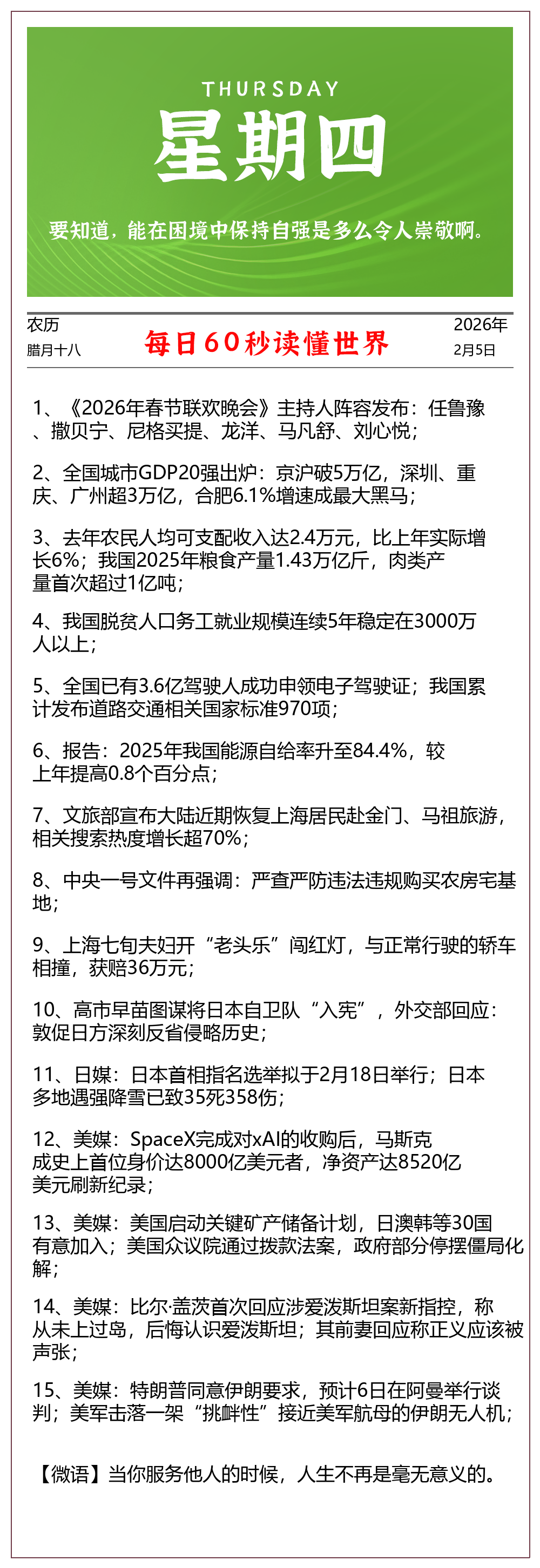 今日寄语【微语】少年若天性,习惯如自然。 今日新闻 1、新冠连续3周居门诊流感样病例就诊首位,专家称:在可控范围内; 2、湖南郴州发现全新B等位基因型血型:稀有程度远超“熊猫血”,将改写人类血型图谱; 3、河南信阳拟发文严控预售许可条件:新出让土地开发的商品房一律现房销售; 4、京东、美团、饿了么等外卖平台被五部门约谈:要求合法规范经营,公平有序竞争; 5、淘宝推出高退款人群屏蔽功能:商家可屏蔽“羊毛党”,仅对天猫、淘宝服饰行业商家开放; 6、网传耗资10亿的广东潮汕豪宅”英之园”将被强拆,官方回应: 属实,系非法占用集体工业土地违建违; 7、广州一饮品店命名“警茶”用疑似警察卡通图案引热议,市监回应:店主已自行拆除相关标识; 8、湖南张家界一村庄铁路穿村而过,多年来已有17人被火车撞身亡,官方回应:基本属实,铁路部门将装护栏; 9、沙县小吃沙特首店开业:店主是90后,首日营业额超5万5万人民币,卤蛋煎蛋约6.7元一个,一份蒸饺34元; 10、中美互降关税24小时:美国客户连夜转账下单,亚马逊卖家赶发货;美财长贝森特称未来几周中美双方或将继续谈; 11、特朗普修令下调对来自中...