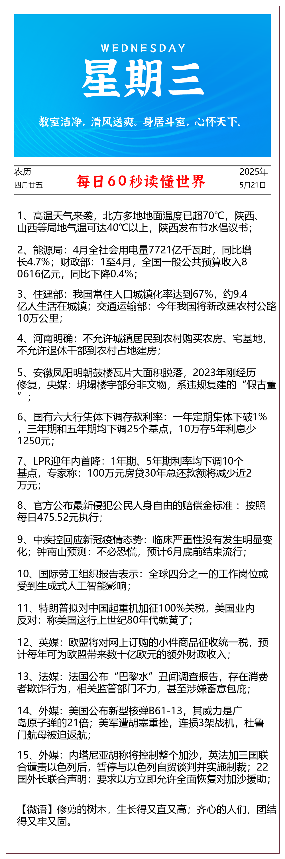 - 2、能源局:4月全社会用电量7721亿千瓦时,同比增长4.7%;财政部:1至4月,全国一般公共预算收入80616亿元,同比下降0.4%;