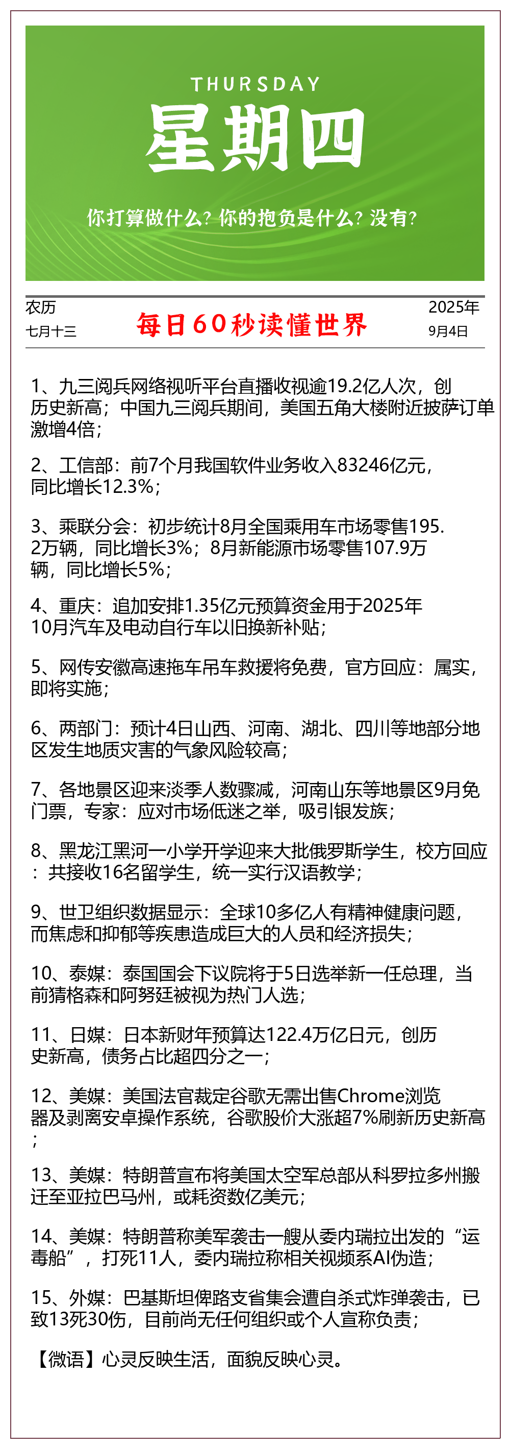 - 1、九三阅兵网络视听平台直播收视逾19.2亿人次,创历史新高;中国九三阅兵期间,美国五角大楼附近披萨订单激增4倍;
