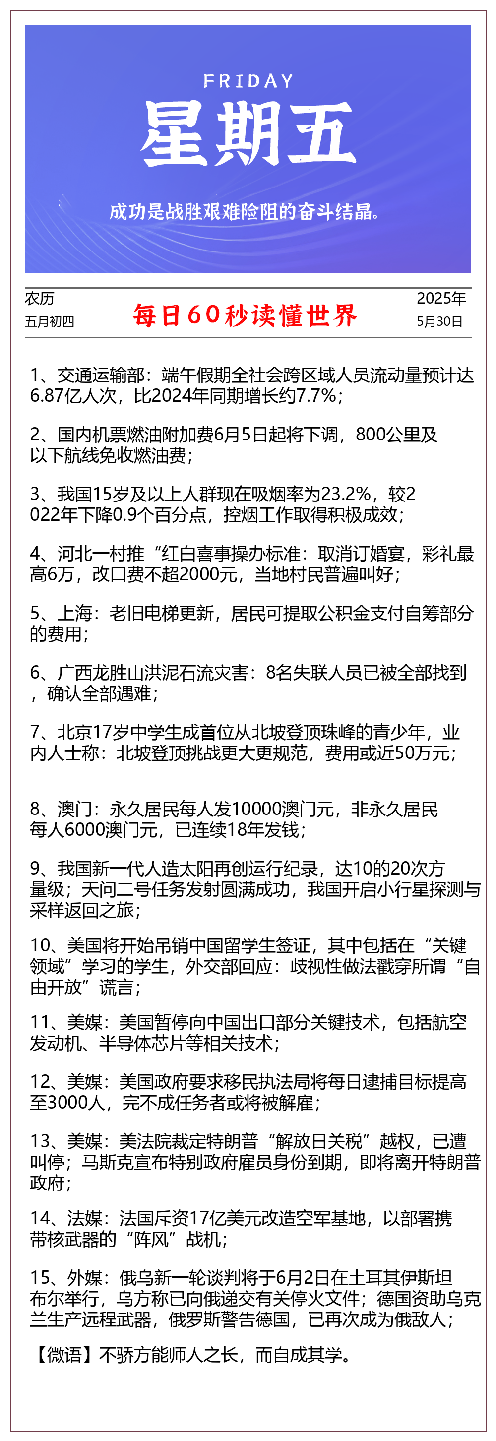 今日寄语【微语】人是文化的创造者,他也是文化的宗旨。真正有文化的人的基本品质,就应该是意识到他对继承人和他的事业的继续者,即对孩子们所负的责任。 今日新闻 1、广东东莞一个村推出生育奖励方案:初婚登记可获1万元奖励,每个小孩获1万元奖励; 2、广西一小学生家长被迫抱婴儿站护学岗,当地教育局通报:已责成学校整改; 3、官方决定调整组建3所军队院校:均为高等教育院校,面向社会招收普通高中毕业生; 4、年内首次降准正式落地:预计将释放长期流动性1万亿,适度宽松效果持续体现; 5、调查组通报董某莹舆情事件:吊销肖某医师执业证书,撤销董某莹四项资格证书; 6、湖南一病重老人被要求亲自取钱在银行办业务时去世,银行回应:家属未说明老人身体情况,将配合调查; 7、雷军宣布:小米自研手机SoC芯片玄戒O1,将于5月下旬发布;四部门:全方位支持科技创新,大力投早、投小、投长期、投硬科技; 8、6月1日起,中国对巴西、阿根廷、智利、秘鲁、乌拉圭持5国实行免签政策,为期一年; 9、中美互降关税后,从中国至美国集装箱运输预订量飙升近300%,7天平均订2.1万集装箱; 10、美国商务部限制华为昇腾芯片...
