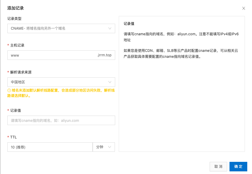我使用的是阿里云的DNS,添加两条解析记录,请求来源选择中国地区解析到腾讯云的CDN,请求来源选择境外解析到cloudflare 的pages。