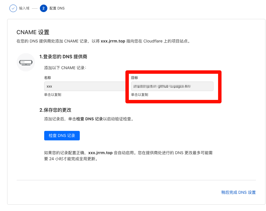 找到刚才部署好的pages,点击 管理 ,找到 自定义域名 ,点击 添加 ,输入你的域名,点击 添加,之后按照页面提示,添加CNAME 记录。