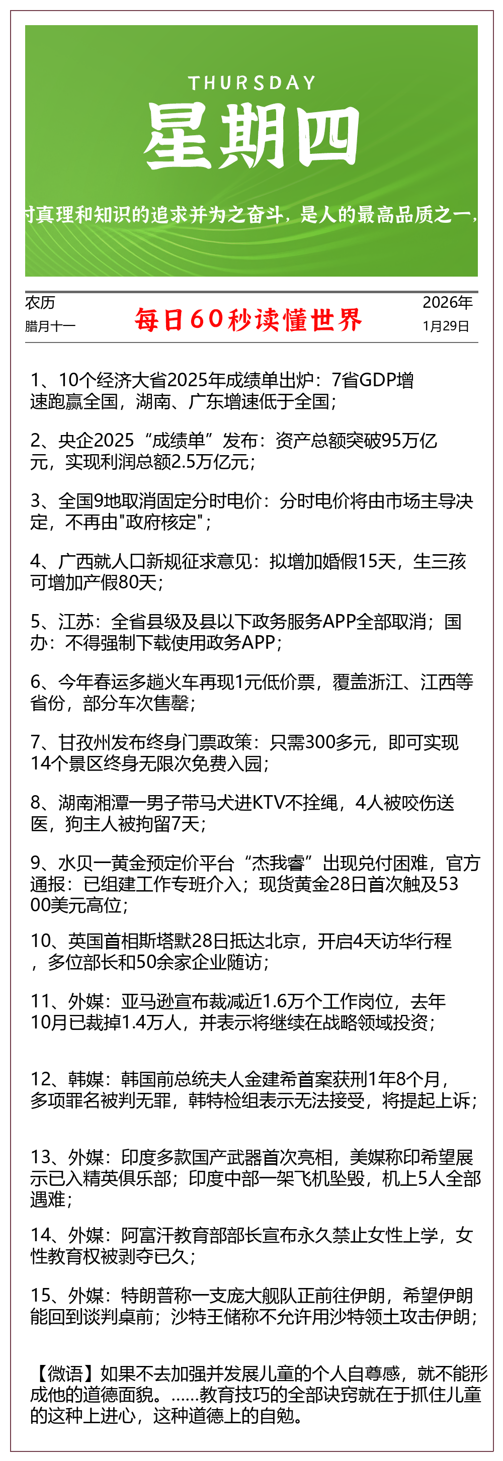 今日寄语【微语】人是文化的创造者,他也是文化的宗旨。真正有文化的人的基本品质,就应该是意识到他对继承人和他的事业的继续者,即对孩子们所负的责任。 今日新闻 1、广东东莞一个村推出生育奖励方案:初婚登记可获1万元奖励,每个小孩获1万元奖励; 2、广西一小学生家长被迫抱婴儿站护学岗,当地教育局通报:已责成学校整改; 3、官方决定调整组建3所军队院校:均为高等教育院校,面向社会招收普通高中毕业生; 4、年内首次降准正式落地:预计将释放长期流动性1万亿,适度宽松效果持续体现; 5、调查组通报董某莹舆情事件:吊销肖某医师执业证书,撤销董某莹四项资格证书; 6、湖南一病重老人被要求亲自取钱在银行办业务时去世,银行回应:家属未说明老人身体情况,将配合调查; 7、雷军宣布:小米自研手机SoC芯片玄戒O1,将于5月下旬发布;四部门:全方位支持科技创新,大力投早、投小、投长期、投硬科技; 8、6月1日起,中国对巴西、阿根廷、智利、秘鲁、乌拉圭持5国实行免签政策,为期一年; 9、中美互降关税后,从中国至美国集装箱运输预订量飙升近300%,7天平均订2.1万集装箱; 10、美国商务部限制华为昇腾芯片...