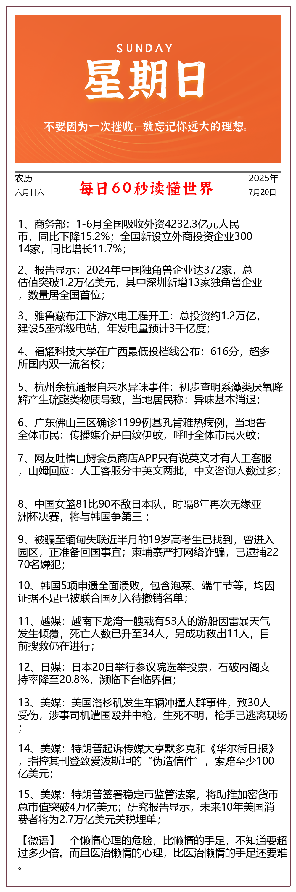 - 1、商务部:1-6月全国吸收外资4232.3亿元人民币,同比下降15.2%;全国新设立外商投资企业30014家,同比增长11.7%;