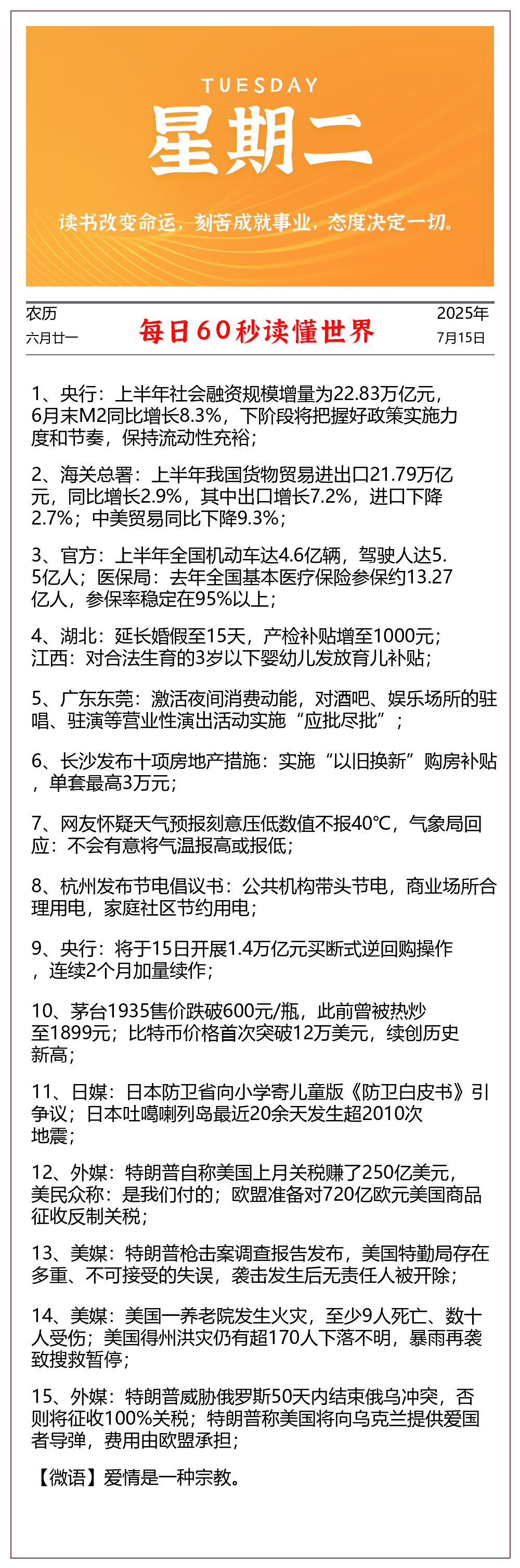 - 1、央行:上半年社会融资规模增量为22.83万亿元,6月末M2同比增长8.3%,下阶段将把握好政策实施力度和节奏,保持流动性充裕;