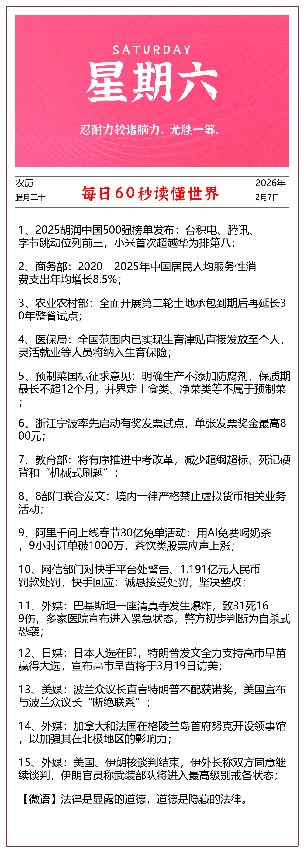 今日寄语【微语】少年若天性,习惯如自然。 今日新闻 1、新冠连续3周居门诊流感样病例就诊首位,专家称:在可控范围内; 2、湖南郴州发现全新B等位基因型血型:稀有程度远超“熊猫血”,将改写人类血型图谱; 3、河南信阳拟发文严控预售许可条件:新出让土地开发的商品房一律现房销售; 4、京东、美团、饿了么等外卖平台被五部门约谈:要求合法规范经营,公平有序竞争; 5、淘宝推出高退款人群屏蔽功能:商家可屏蔽“羊毛党”,仅对天猫、淘宝服饰行业商家开放; 6、网传耗资10亿的广东潮汕豪宅”英之园”将被强拆,官方回应: 属实,系非法占用集体工业土地违建违; 7、广州一饮品店命名“警茶”用疑似警察卡通图案引热议,市监回应:店主已自行拆除相关标识; 8、湖南张家界一村庄铁路穿村而过,多年来已有17人被火车撞身亡,官方回应:基本属实,铁路部门将装护栏; 9、沙县小吃沙特首店开业:店主是90后,首日营业额超5万5万人民币,卤蛋煎蛋约6.7元一个,一份蒸饺34元; 10、中美互降关税24小时:美国客户连夜转账下单,亚马逊卖家赶发货;美财长贝森特称未来几周中美双方或将继续谈; 11、特朗普修令下调对来自中...