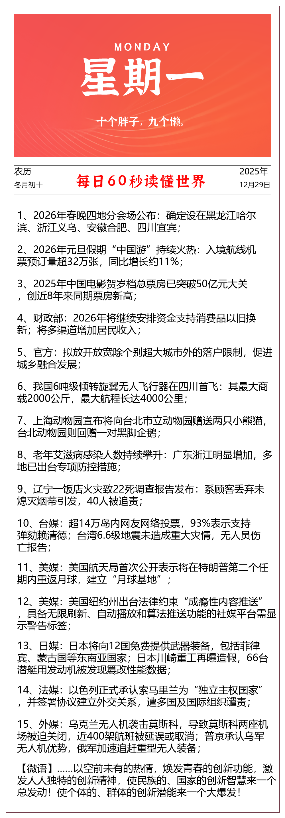 今日寄语【微语】少年若天性,习惯如自然。 今日新闻 1、新冠连续3周居门诊流感样病例就诊首位,专家称:在可控范围内; 2、湖南郴州发现全新B等位基因型血型:稀有程度远超“熊猫血”,将改写人类血型图谱; 3、河南信阳拟发文严控预售许可条件:新出让土地开发的商品房一律现房销售; 4、京东、美团、饿了么等外卖平台被五部门约谈:要求合法规范经营,公平有序竞争; 5、淘宝推出高退款人群屏蔽功能:商家可屏蔽“羊毛党”,仅对天猫、淘宝服饰行业商家开放; 6、网传耗资10亿的广东潮汕豪宅”英之园”将被强拆,官方回应: 属实,系非法占用集体工业土地违建违; 7、广州一饮品店命名“警茶”用疑似警察卡通图案引热议,市监回应:店主已自行拆除相关标识; 8、湖南张家界一村庄铁路穿村而过,多年来已有17人被火车撞身亡,官方回应:基本属实,铁路部门将装护栏; 9、沙县小吃沙特首店开业:店主是90后,首日营业额超5万5万人民币,卤蛋煎蛋约6.7元一个,一份蒸饺34元; 10、中美互降关税24小时:美国客户连夜转账下单,亚马逊卖家赶发货;美财长贝森特称未来几周中美双方或将继续谈; 11、特朗普修令下调对来自中...