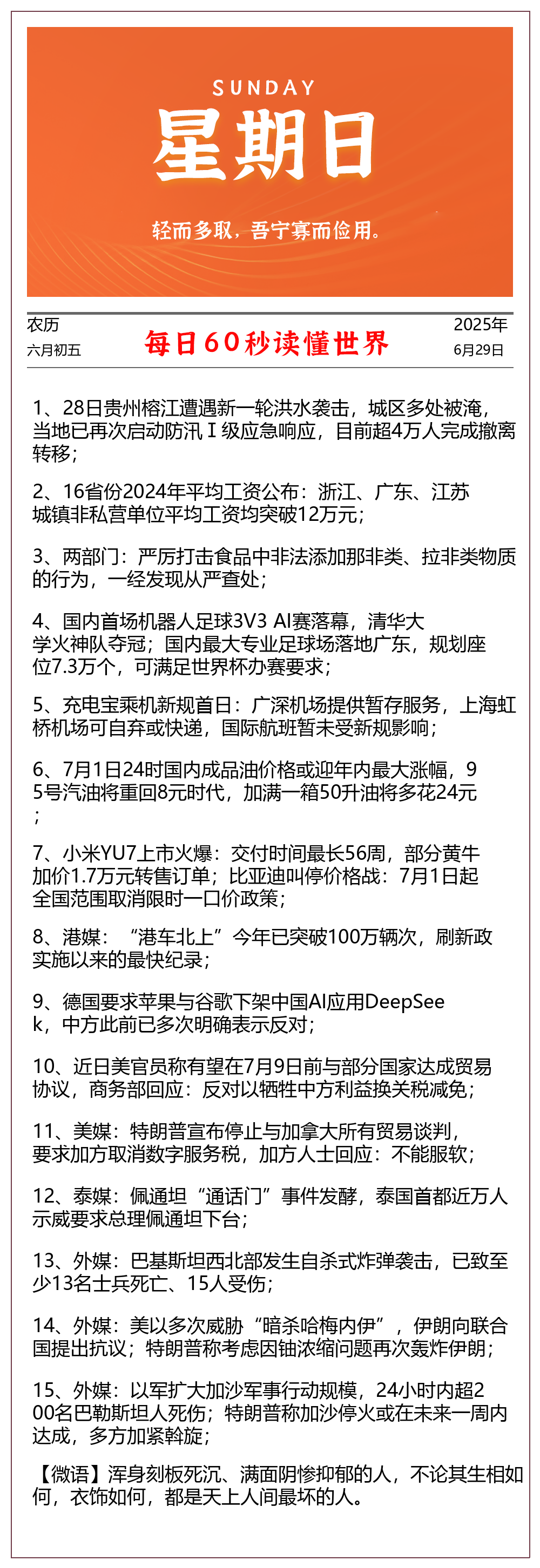 今日寄语【微语】人是文化的创造者,他也是文化的宗旨。真正有文化的人的基本品质,就应该是意识到他对继承人和他的事业的继续者,即对孩子们所负的责任。 今日新闻 1、广东东莞一个村推出生育奖励方案:初婚登记可获1万元奖励,每个小孩获1万元奖励; 2、广西一小学生家长被迫抱婴儿站护学岗,当地教育局通报:已责成学校整改; 3、官方决定调整组建3所军队院校:均为高等教育院校,面向社会招收普通高中毕业生; 4、年内首次降准正式落地:预计将释放长期流动性1万亿,适度宽松效果持续体现; 5、调查组通报董某莹舆情事件:吊销肖某医师执业证书,撤销董某莹四项资格证书; 6、湖南一病重老人被要求亲自取钱在银行办业务时去世,银行回应:家属未说明老人身体情况,将配合调查; 7、雷军宣布:小米自研手机SoC芯片玄戒O1,将于5月下旬发布;四部门:全方位支持科技创新,大力投早、投小、投长期、投硬科技; 8、6月1日起,中国对巴西、阿根廷、智利、秘鲁、乌拉圭持5国实行免签政策,为期一年; 9、中美互降关税后,从中国至美国集装箱运输预订量飙升近300%,7天平均订2.1万集装箱; 10、美国商务部限制华为昇腾芯片...