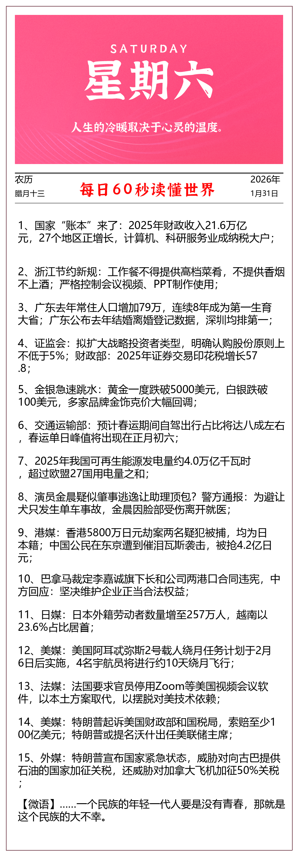 • 1、国家“账本”来了:2025年财政收入21.6万亿元,27个地区正增长,计算机、科研服务业成纳税大户;