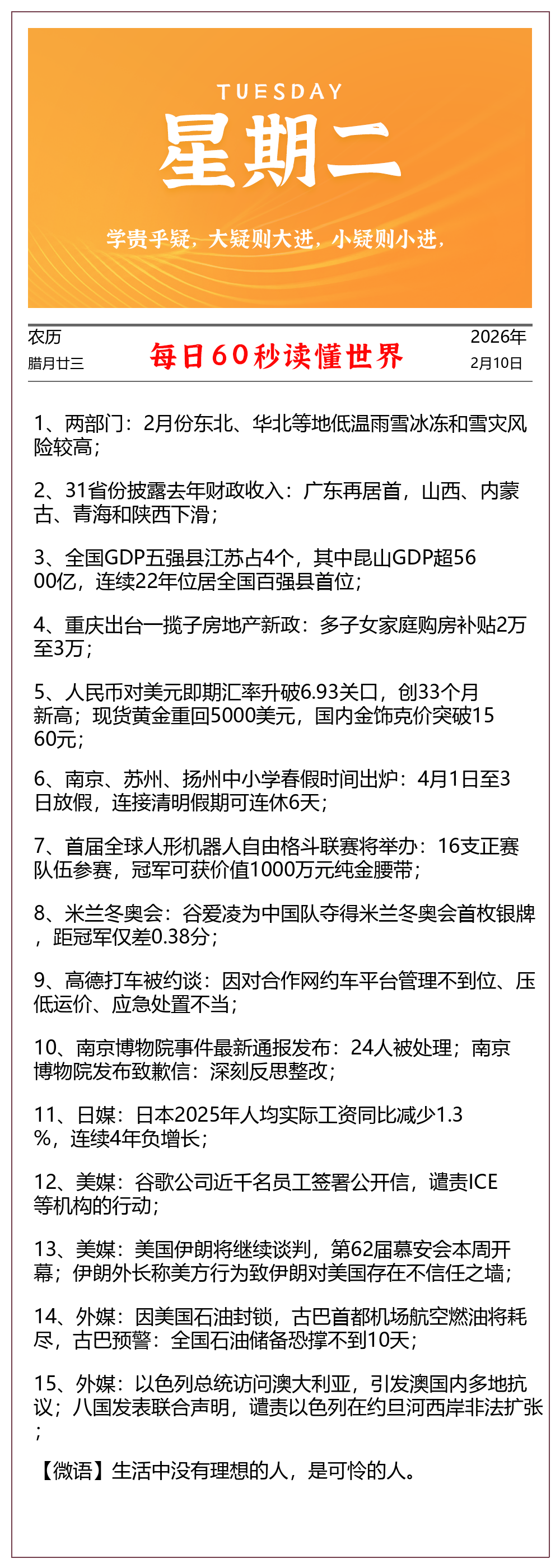 今日寄语【微语】没有艰苦劳动,就没有科学创造。 今日新闻 1、我国4月货物贸易进出口同比增长5.6%,为历史次高,其中出口2.27万亿增长9.3%,进口1.57万亿,增长0.8%; 2、央行最新报告:积极落地5月推出的一揽子金融政策,促进经济供需平衡、物价合理回升; 3、新修订的《婚姻登记条例》10日起施行:办理结婚、离婚登记都无需再出示户口本; 4、湖北明确:将延长3天婚假、设置中小学春秋假,鼓励带薪年休假与小长假连休; 5、上海发布首份直播电商行业自律公约,禁止虚假宣传、商业诋毁; 6、京东首创外卖行业最严准入标准:发现无堂食餐厅奖励40元饭卡,上不封顶; 7、工信部出手整顿隐藏式车门把手:保证断电、碰撞时,车门系统能够开启; 8、百度地图被指“见缝插针”在导航路面植入广告,网友称影响行车安全,百度地图回应:将核实处理; 9、环球小姐李思萱学历造假:假文凭骗取港大硕士录取,获刑240天; 10、比特币时隔三个月再次突破10万美元,比特币市值排名升至全球第五,超越亚马逊; 11、外媒:美商务部长称下一个贸易协议签署国可能是印度,印度被曝愿意削减三分之二的关税差,力求与特朗普...