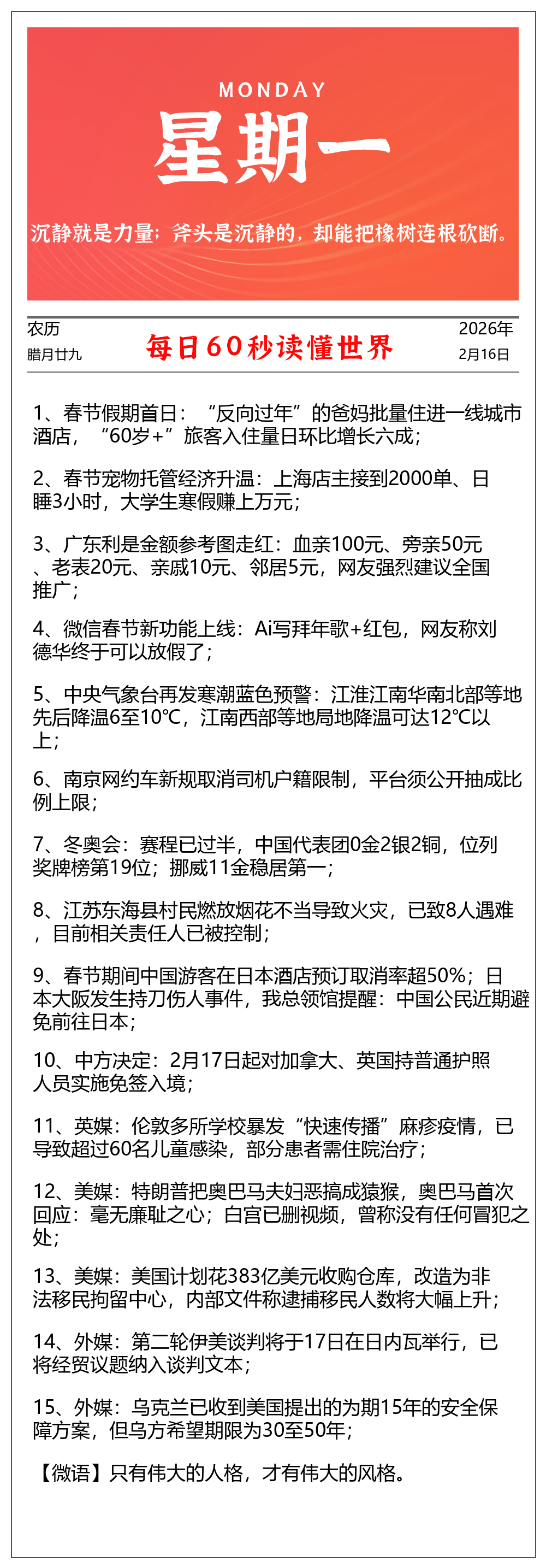 今日寄语【微语】少年若天性,习惯如自然。 今日新闻 1、新冠连续3周居门诊流感样病例就诊首位,专家称:在可控范围内; 2、湖南郴州发现全新B等位基因型血型:稀有程度远超“熊猫血”,将改写人类血型图谱; 3、河南信阳拟发文严控预售许可条件:新出让土地开发的商品房一律现房销售; 4、京东、美团、饿了么等外卖平台被五部门约谈:要求合法规范经营,公平有序竞争; 5、淘宝推出高退款人群屏蔽功能:商家可屏蔽“羊毛党”,仅对天猫、淘宝服饰行业商家开放; 6、网传耗资10亿的广东潮汕豪宅”英之园”将被强拆,官方回应: 属实,系非法占用集体工业土地违建违; 7、广州一饮品店命名“警茶”用疑似警察卡通图案引热议,市监回应:店主已自行拆除相关标识; 8、湖南张家界一村庄铁路穿村而过,多年来已有17人被火车撞身亡,官方回应:基本属实,铁路部门将装护栏; 9、沙县小吃沙特首店开业:店主是90后,首日营业额超5万5万人民币,卤蛋煎蛋约6.7元一个,一份蒸饺34元; 10、中美互降关税24小时:美国客户连夜转账下单,亚马逊卖家赶发货;美财长贝森特称未来几周中美双方或将继续谈; 11、特朗普修令下调对来自中...