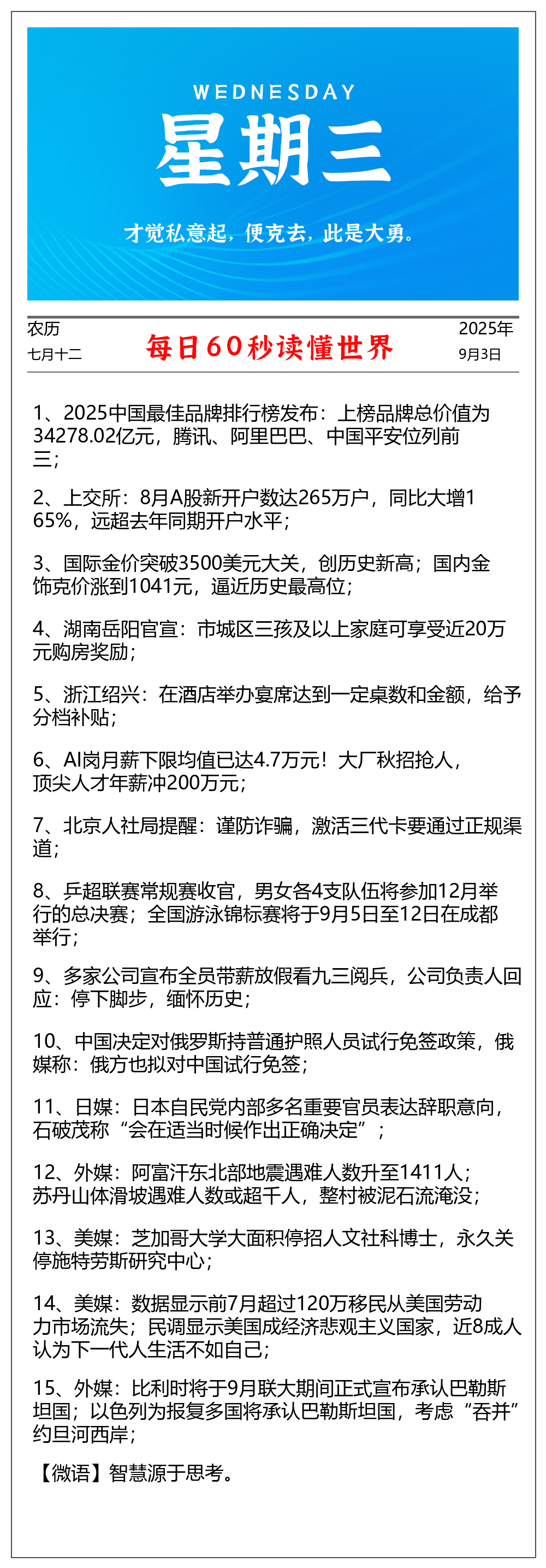 今日寄语【微语】少年若天性,习惯如自然。 今日新闻 1、新冠连续3周居门诊流感样病例就诊首位,专家称:在可控范围内; 2、湖南郴州发现全新B等位基因型血型:稀有程度远超“熊猫血”,将改写人类血型图谱; 3、河南信阳拟发文严控预售许可条件:新出让土地开发的商品房一律现房销售; 4、京东、美团、饿了么等外卖平台被五部门约谈:要求合法规范经营,公平有序竞争; 5、淘宝推出高退款人群屏蔽功能:商家可屏蔽“羊毛党”,仅对天猫、淘宝服饰行业商家开放; 6、网传耗资10亿的广东潮汕豪宅”英之园”将被强拆,官方回应: 属实,系非法占用集体工业土地违建违; 7、广州一饮品店命名“警茶”用疑似警察卡通图案引热议,市监回应:店主已自行拆除相关标识; 8、湖南张家界一村庄铁路穿村而过,多年来已有17人被火车撞身亡,官方回应:基本属实,铁路部门将装护栏; 9、沙县小吃沙特首店开业:店主是90后,首日营业额超5万5万人民币,卤蛋煎蛋约6.7元一个,一份蒸饺34元; 10、中美互降关税24小时:美国客户连夜转账下单,亚马逊卖家赶发货;美财长贝森特称未来几周中美双方或将继续谈; 11、特朗普修令下调对来自中...