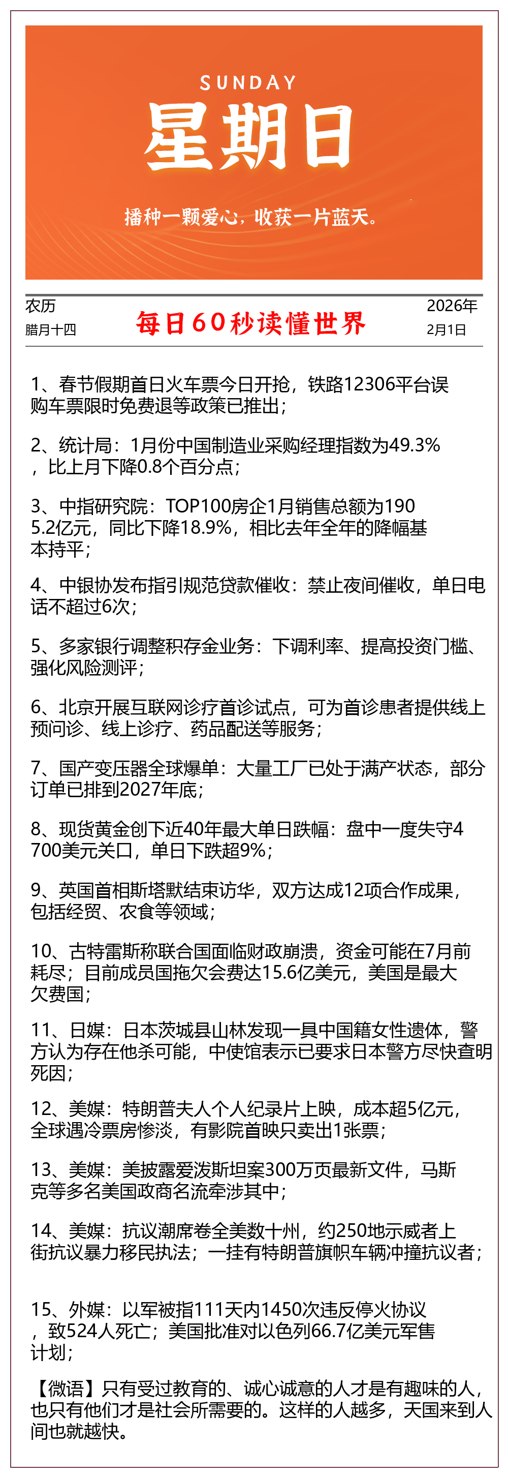 今日寄语【微语】少年若天性,习惯如自然。 今日新闻 1、新冠连续3周居门诊流感样病例就诊首位,专家称:在可控范围内; 2、湖南郴州发现全新B等位基因型血型:稀有程度远超“熊猫血”,将改写人类血型图谱; 3、河南信阳拟发文严控预售许可条件:新出让土地开发的商品房一律现房销售; 4、京东、美团、饿了么等外卖平台被五部门约谈:要求合法规范经营,公平有序竞争; 5、淘宝推出高退款人群屏蔽功能:商家可屏蔽“羊毛党”,仅对天猫、淘宝服饰行业商家开放; 6、网传耗资10亿的广东潮汕豪宅”英之园”将被强拆,官方回应: 属实,系非法占用集体工业土地违建违; 7、广州一饮品店命名“警茶”用疑似警察卡通图案引热议,市监回应:店主已自行拆除相关标识; 8、湖南张家界一村庄铁路穿村而过,多年来已有17人被火车撞身亡,官方回应:基本属实,铁路部门将装护栏; 9、沙县小吃沙特首店开业:店主是90后,首日营业额超5万5万人民币,卤蛋煎蛋约6.7元一个,一份蒸饺34元; 10、中美互降关税24小时:美国客户连夜转账下单,亚马逊卖家赶发货;美财长贝森特称未来几周中美双方或将继续谈; 11、特朗普修令下调对来自中...