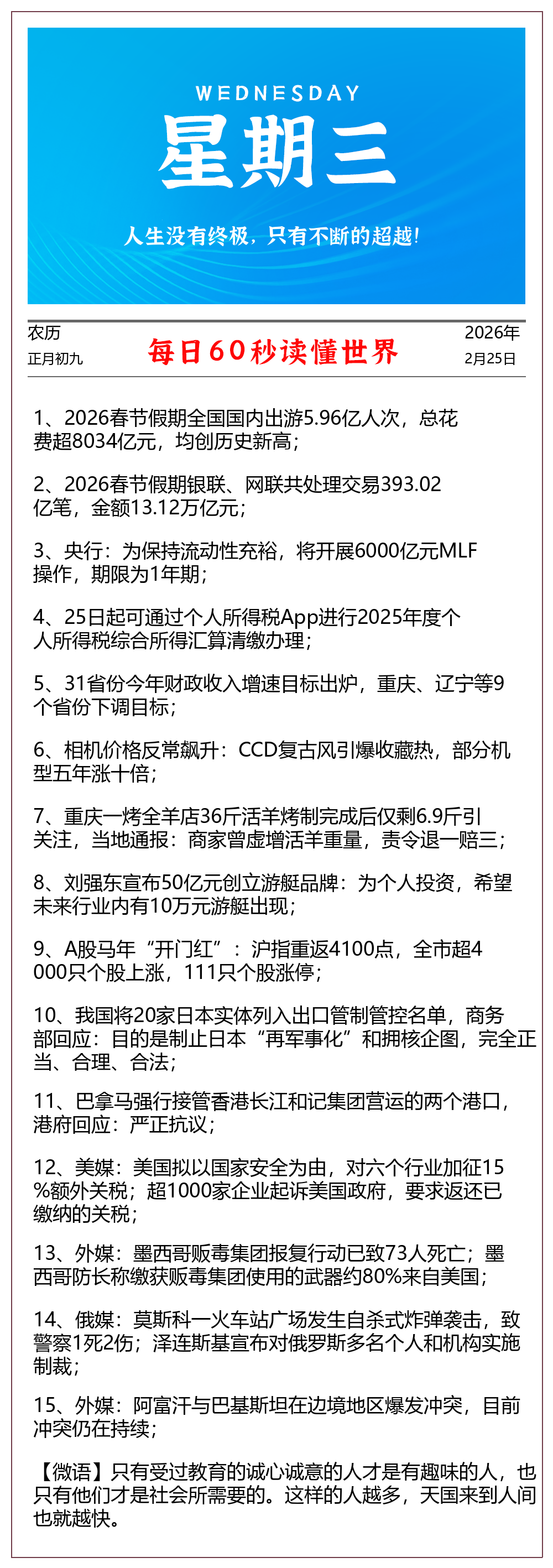 • 1、2026春节假期全国国内出游5.96亿人次,总花费超8034亿元,均创历史新高;