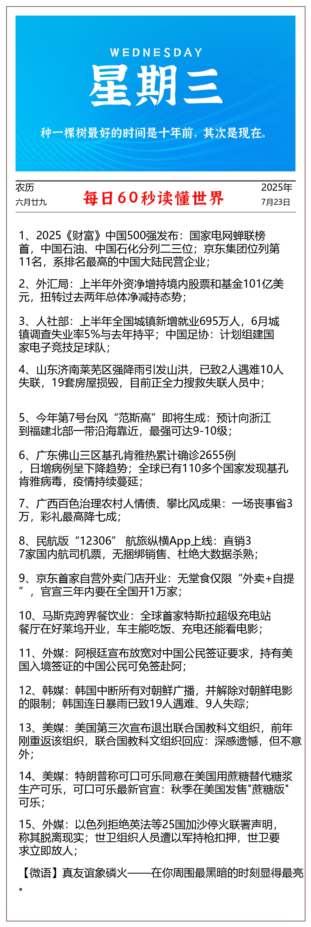 - 1、2025《财富》中国500强发布:国家电网蝉联榜首,中国石油、中国石化分列二三位;京东集团位列第11名,系排名最高的中国大陆民营企业;