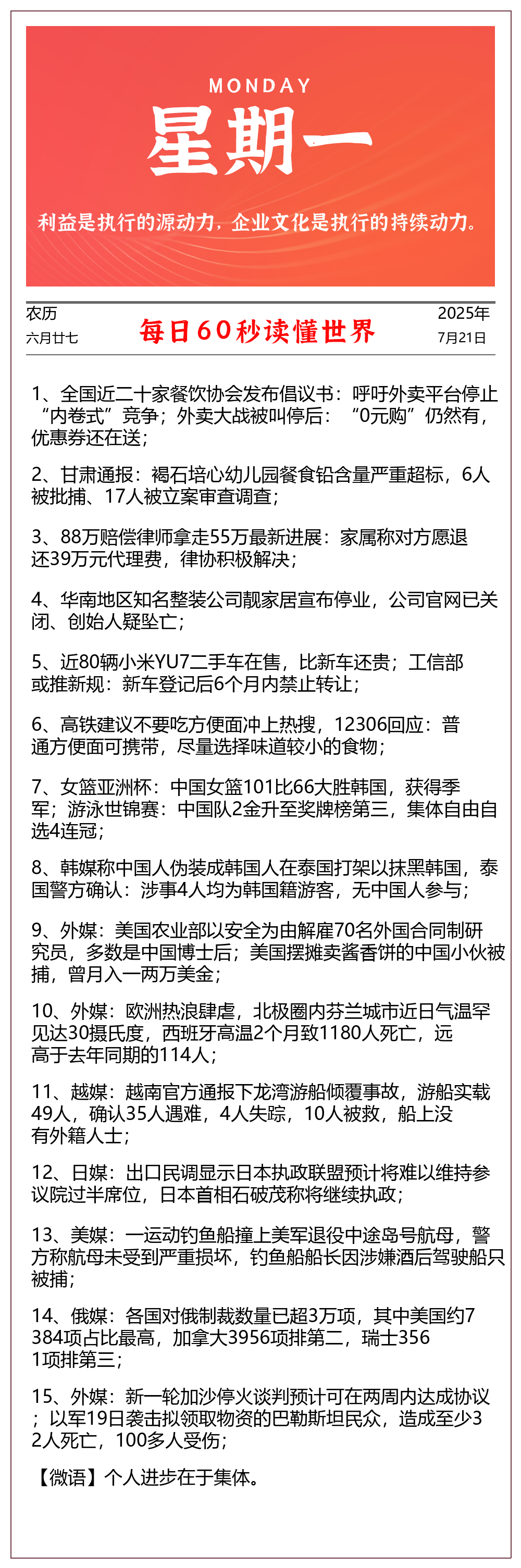 - 1、全国近二十家餐饮协会发布倡议书:呼吁外卖平台停止“内卷式”竞争;外卖大战被叫停后:“0元购”仍然有,优惠券还在送;