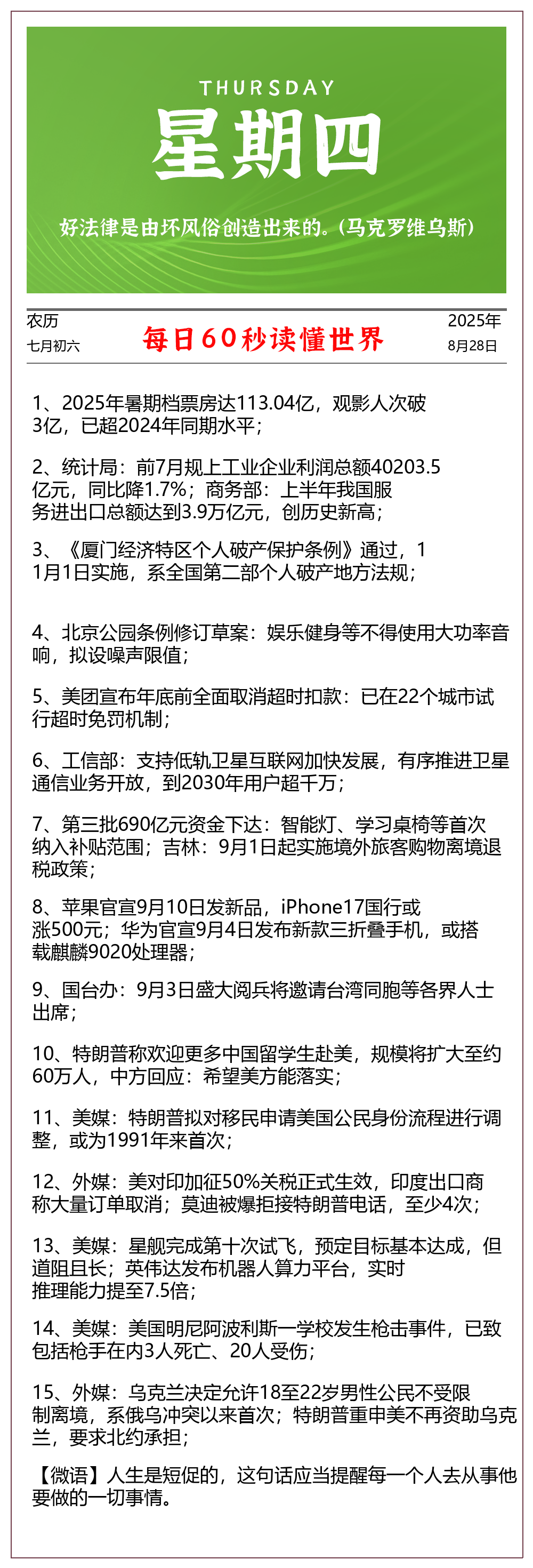 今日寄语【微语】少年若天性,习惯如自然。 今日新闻 1、新冠连续3周居门诊流感样病例就诊首位,专家称:在可控范围内; 2、湖南郴州发现全新B等位基因型血型:稀有程度远超“熊猫血”,将改写人类血型图谱; 3、河南信阳拟发文严控预售许可条件:新出让土地开发的商品房一律现房销售; 4、京东、美团、饿了么等外卖平台被五部门约谈:要求合法规范经营,公平有序竞争; 5、淘宝推出高退款人群屏蔽功能:商家可屏蔽“羊毛党”,仅对天猫、淘宝服饰行业商家开放; 6、网传耗资10亿的广东潮汕豪宅”英之园”将被强拆,官方回应: 属实,系非法占用集体工业土地违建违; 7、广州一饮品店命名“警茶”用疑似警察卡通图案引热议,市监回应:店主已自行拆除相关标识; 8、湖南张家界一村庄铁路穿村而过,多年来已有17人被火车撞身亡,官方回应:基本属实,铁路部门将装护栏; 9、沙县小吃沙特首店开业:店主是90后,首日营业额超5万5万人民币,卤蛋煎蛋约6.7元一个,一份蒸饺34元; 10、中美互降关税24小时:美国客户连夜转账下单,亚马逊卖家赶发货;美财长贝森特称未来几周中美双方或将继续谈; 11、特朗普修令下调对来自中...