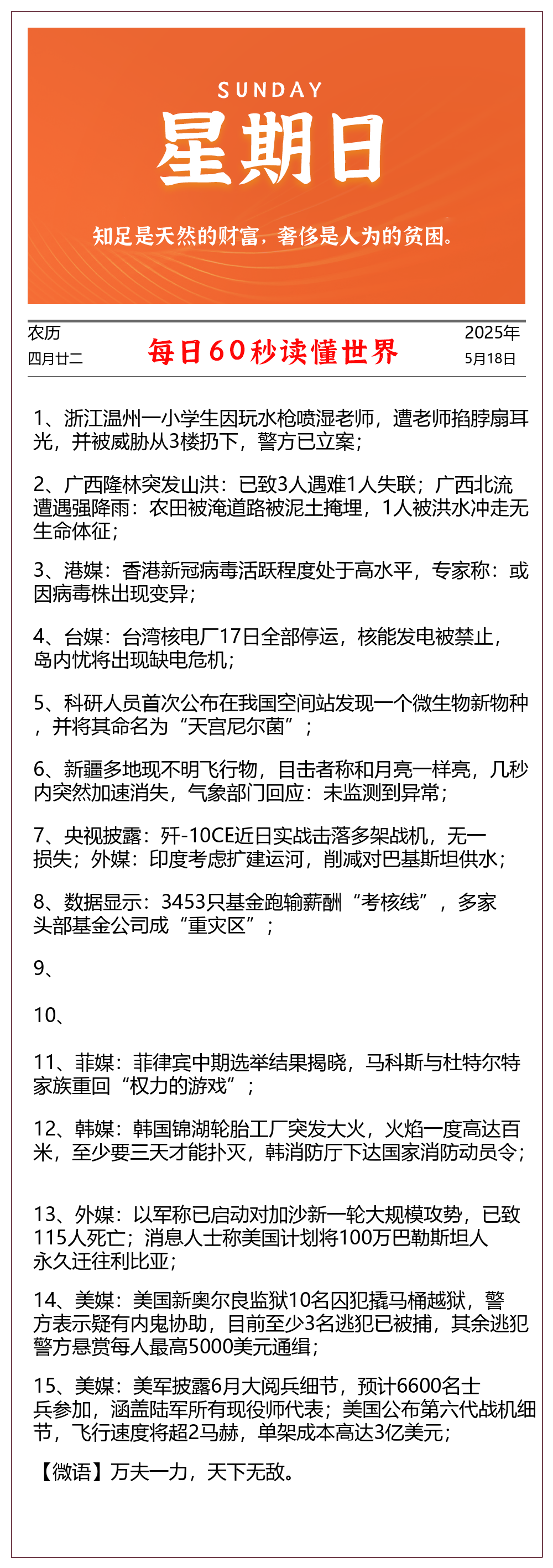 今日寄语【微语】细水长流年年有,大吃大喝不长久。 今日新闻 1、南方未来10天捅了“雨窝”:贵州、湖南、广西等多地持续多雨模式,降雨过程一轮接着一轮; 2、4月信贷“成绩单”出炉:贷款规模合理增长,利率保持历史低位; 3、金价连续大跌:现货黄金一度跌至3180美元下方,国内金饰价格已集体回落至千元下方,有人买手镯半个月缩水2000多元; 4、山东一考生因救人错过春季高考语文考试,官方最新回应:启用副题,安排参加考试; 5、女子在上海旅游一个月住十多家酒店,均称皮肤过敏要求退房费,涉嫌寻衅滋事罪被刑拘; 6、黑龙江绥化多名公职人员冒充残疾人骗补贴,一特级教师持言语二级残疾证; 7、杭州“放大招”支持足球发展:足球人才可评“高层次人才”; 8、腾讯再度进击电商:微信成立电商产品部,负责运营微信交易新模式; 9、中国和乌兹别克斯坦将互免签证,协定明年6月生效,已有29国与中国全面互免签证; 10、马媒:马来西亚18岁中国留学生自导自演遭绑架,骗取父母500万赎金,已被警方逮捕; 11、美国对华芯片封锁升级:禁止在全球任何地方使用华为昇腾芯片;限制AI芯片用于中国AI模型; 12、外...